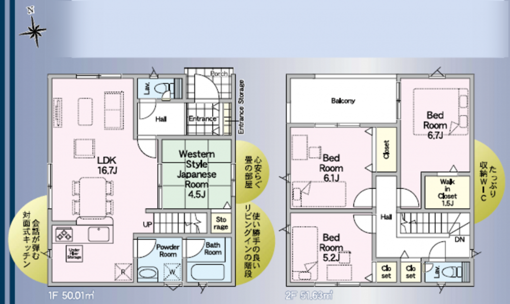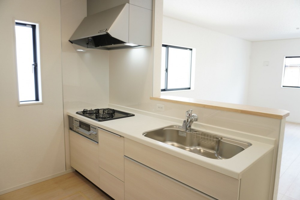 システムキッチン、カウンターキッチン、シャンプードレッサー、洗浄便座、浴室乾燥機、追い焚き、複層ガラス、ルーフバルコニー、モニタ付インターホン、駐車場2台分、床下収納、トイレ2箇所